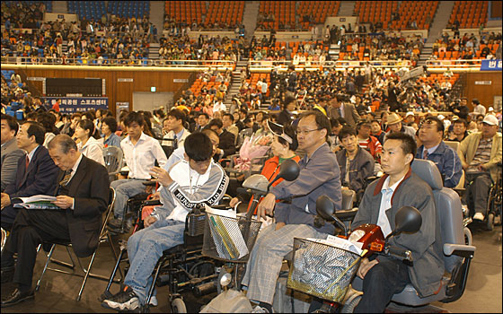 [현장 7보]오전11시20분/서울올림픽공원 펜싱경기장 외부=지난 14일 천안에서 장애인 조국순례대장정에 나섰던 (사)한국장애인 복지시설협회 소속 평화의 집 장애인들이 장애인 기념식 행사장 앞에 도착했다.