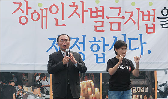 노 의원이외에 국회의원으로서는 유일하게 참석한 한나라당 정화원 의원도 “반드시 장차법이 통과돼서 한국에 있는 장애인 누구라도 차별을 받지 않고 멸시를 받지 않고 행복하게 살 수 있는 사회를 만들어야 한다”고 목청을 높였다.