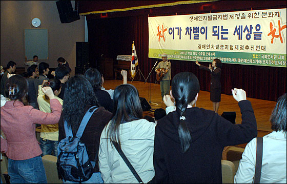 장애인차별금지법제정추진연대 변경택 공동대표는 26일 오후 국회도서관 대강당에서 열린 ‘장애인차별금지법 제정을 위한 문화제’의 의미를 이렇게 설명했다. 이날 문화제의 슬로건은 ‘차이가 차별이 되는 세상을 차버리자’. 장애인차별금지법을 통해 차별 없는 세상을 이루겠다는 의지를 담았다.