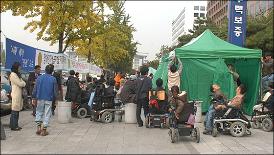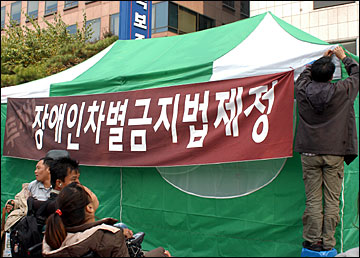 장애인차별금지법 제정을 위해 지난 10월 26일부터 서울 여의도 국회의사당 건너편 국민은행 앞에서 천막농성을 시작한 장애인차별금지법제정공동투쟁단(이하 공동투쟁단)은 1일 농성장에서 기자회견을 열고 이같이 밝혔다.