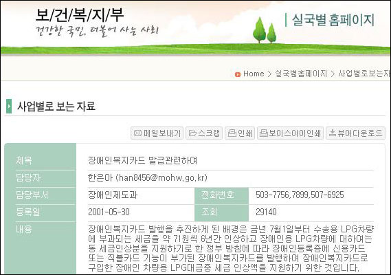 장애인복지법은 1981년에 제정되었고 장애인등록제도는 1988년부터 시작되었다. 등록장애인에게는 약간의 복지혜택이 주어졌는데 1990년 5월 1일부터 장애인차량은 LPG 연료사용이 허용되었다. LPG연료를 사용하는 차량은 영업용 택시인데 여기에 장애인차량이 추가된 것이다.