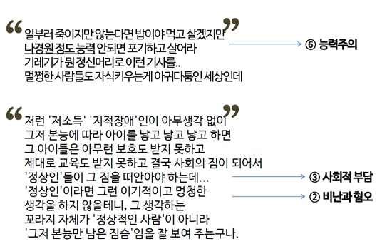 한국장애인인권포럼이 최근 발달장애인 부부의 자녀양육실태 관련, 인터넷 검색 포털 3사 기사 댓글 1169건을 분석해봤습니다. 이기적인 장애인에 대한 비난과 혐오형이 26%로 가장 많았고, 우생학적 사유 14%, 동정 18%, 사회적 부담 13% 등의 다양한 내용입니다.