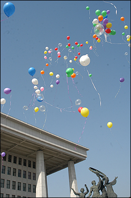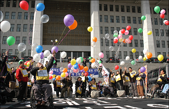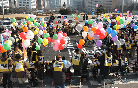 이러한 요구를 담아 이날 기자회견에 참석한 장추련 회원 70여명은 풍선을 하늘에 날리기도 했다. 특히 이날 기자회견이 열린 국회 앞마당에 지난해 3, 4월 국가인권위원회 점거농성을 할 때 인권위 건물 외벽에 설치했던 ‘대한민국에 장애인 인권은 없다’는 내용의 대형현수막을 깔고, 장애인차별금지법 제정에 대한 의지를 전했다.