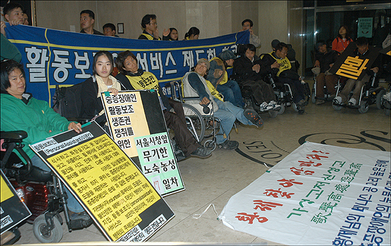활동보조인서비스 제도화와 관련한 이명박 서울시장 면담을 요구하고 있는 전국장애인차별철폐연대(준)가 5일 오전 서울시가 주최한 ‘서울 노들섬 예술센터 국제 심포지엄’ 행사장을 찾아가 기습시위를 벌였다.
