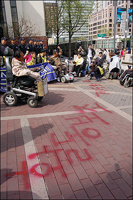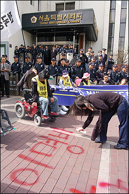 이날 기자회견 후 전장연(준)은 서울시의회 앞 보도에 빨간색 페인트 스프레이를 이용해 ‘이명박’ ‘활동보조 제도화하라’라는 글자를 적으며 항의의 뜻을 표시했다. 서울시 장애인복지과 관계자들은 이날 기자회견 과정을 모두 지켜봤다.