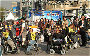 전국장애인차별철폐연대(준)이 활동보조인 서비스 제도화를 위한 이명박 서울시장 면담을 촉구하는 ‘황제찾아 삼만리’ 그 네 번째 투쟁을 진행했다. 이번 시위는 서울시가 한국장애인단체총연맹과 함께 오는 제26회 장애인의 날을 맞아 15일 서울시청 앞 광장에서 개최한 ‘제4회 서울시민 문화축제 Hi Seoul 개성마당' 행사가 열리고 있는 가운데 진행됐다.