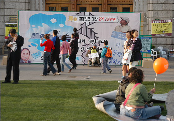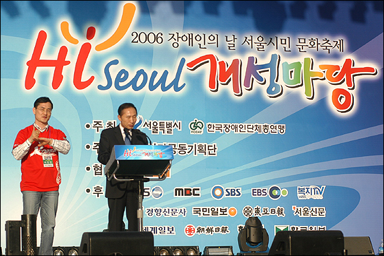 이날 서울시청 정문 앞에서 시위가 진행되고 가운데 ‘서울특별시 장애인의 날 기념식’ 무대에 오른 이명박 시장은 서울시 장애인 복지증진과 인권신장 등에 기여한 사람 및 기관에 표창하고, 축사를 전했다.