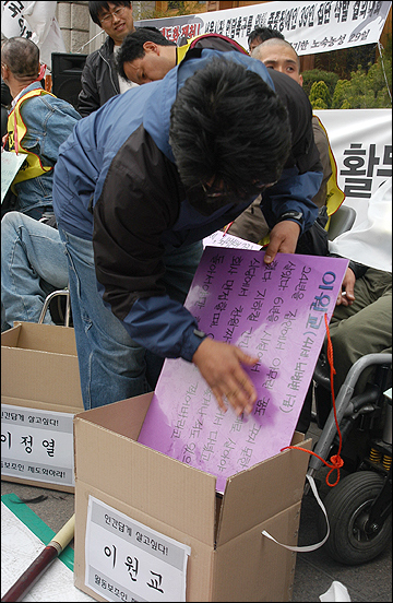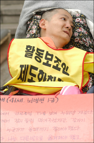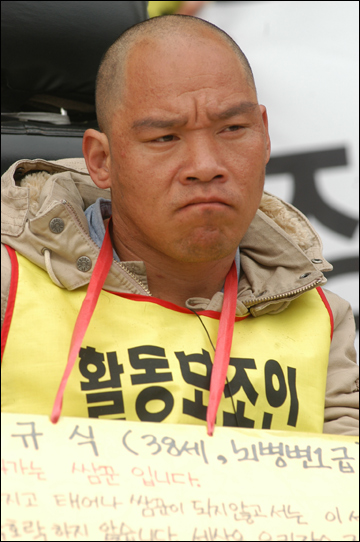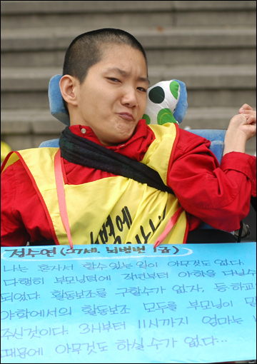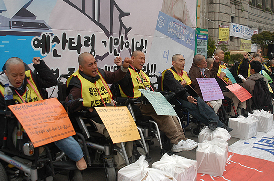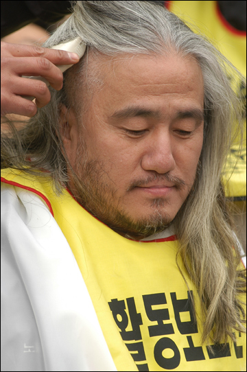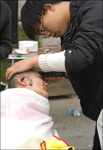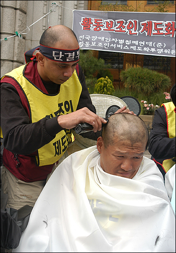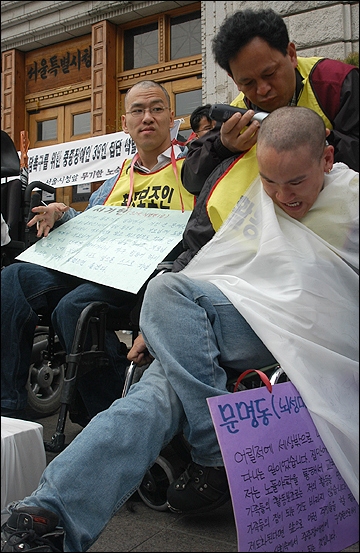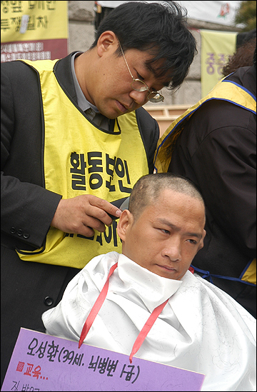활동보조인 서비스 제도화를 요구하며 서울시청 앞에서 29일째 노숙농성을 진행하고 있는 전국장애인차별철폐연대 준비위원회가 17일 오후 이명박 서울시장 면담을 촉구하며 39명의 삭발식을 진행했다.