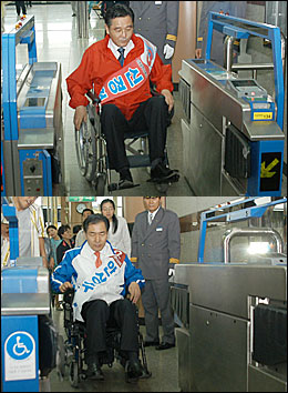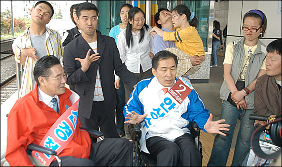 한나라당 안상수, 민주당 신경철 인천시장 후보가 지난 18일 오후 인천 주안역에서 휠체어를 타고 이동해 지하철을 타는 등의 장애체험을 하고 나서 이렇게 약속했다. 이날 행사는 대한인천뇌성마비협회(회장 이제유)가 준비한 ‘시장후보들과 함께하는 1일 장애 체험’으로 대한인천뇌성마비협회 회원 10여명이 참여했다.