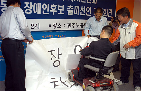 5·31 지방선거 후보등록을 마친 민주노동당 소속 장애인 후보들이 22일 서울 여의도 민주노동당 4층 대회의실에서 기자회견을 갖고, 공식 출마선언을 했다.