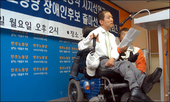 서울 강남구 기초의원(비례대표)에 도전하는 강현욱(33·남·뇌병변)씨는 지난해 민주노동당 중앙위원을 지냈고, 현재 굿잡장애인자립생활센터에서 활동하고 있는 활동가다.