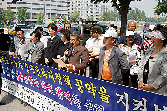 2006지방선거장애인연대와 서울지방선거장애인연대는 30일 오전 서울 여의도 국회앞 국민은행 앞에서 기자회견을 열어 "장애인의 투표 참여로 세상을 바꾸자"며 장애인유권자들의 투표 참여를 독려했다.